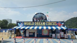 手前には、城山公園で公演中のサーカステント、奥の空との境目は瀬戸内海です。
